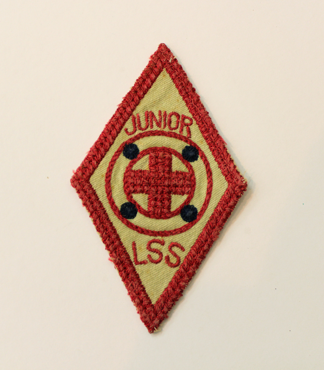 Tan cotton twill "Life Saving School" patch, Red Cross. Diamond-shaped patch with red embroidered edge and off-white ground. Red double circle with red cross in center, four black dots at intervals between circles (resembling a life preserver). Embroidered lettering, "JUNIOR/LSS."
