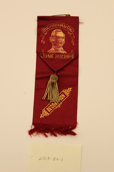 G.A.R. Governor Buckingham ribbon. Dark red satin ribbon with top third folded over. Bottom edge folded and tacked into a point with a metallic thread tassel. Gold printing: "BUCKINGHAM (inside an arching banner) / (below is a bust of Governor William A. Buckingham of Connecticut, governor during the Civil War) / (another banner) JUNE 18TH 1884 / DECORATION." Safety pin along back of top edge.