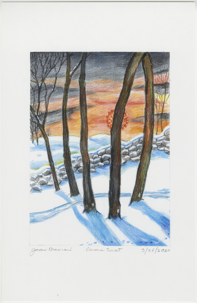Landscape scene showing a grouping of trees in the foreground. Landscape covered in snow. Laid stone wall in middle ground with sunset in background. Just off center, the sun has been drawn to resemble a COVID-19 particle. Animal tracks in snow at extreme of foreground, path in snow passing between trees.