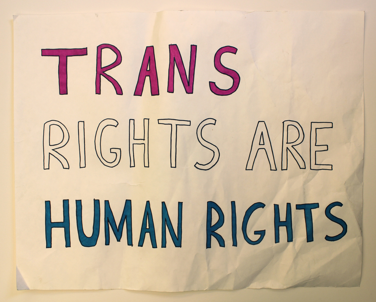Handmade sign. White poster board decorated with colored markers. Three lines of text, aligned at left sign, "TRANS/RIGHT ARE/HUMAN RIGHTS" in magenta, white, and blue lettering. Letters outlined in black.