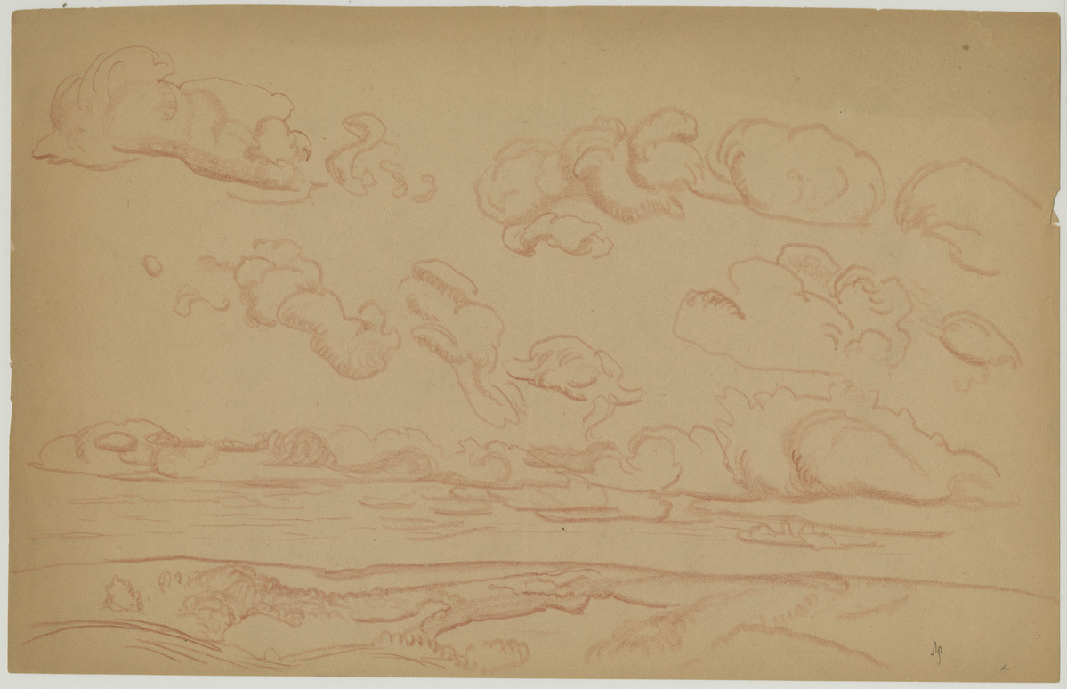Red colored pencil sketch of landscape with clouds on paper. Landscape in the foreground is dotted with trees and rolling hills. Running towards the horizon is a body of water dotted with the blurry outlines of ships. Initialed in pencil at the bottom right hand corner, no date.