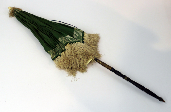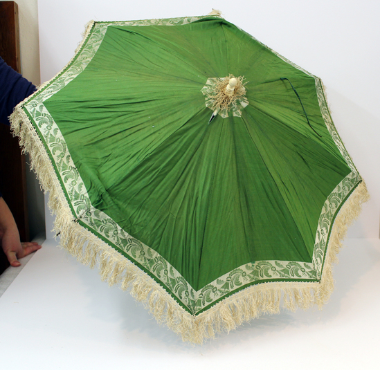 Parasol; folding; kelly green silk with compound weave border pattern in white and green of bell-shaped flowers and acanthus leaves; long ivory silk fringe at base of cover and below ferrule; ivory ferrule with knob at top; dark brown turned wood tube with dimple effect and two decorative collars