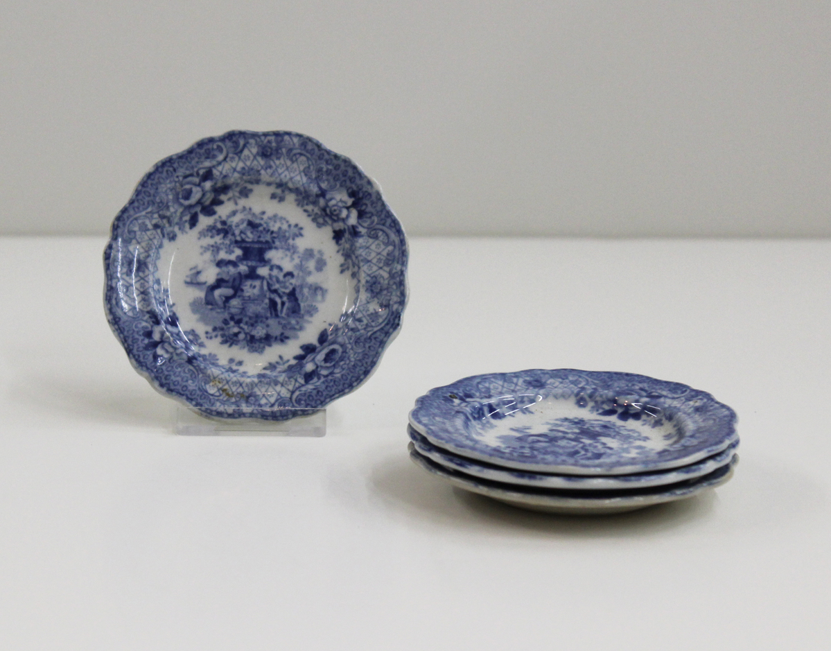 Glazed earthenware dishes used as toys or play teaware. White ceramic with blue transfer-printed decoration. Dish well features an image of four children seated by a large urn which holds a cluster of flowers and plants. There is a castle visible to the far right and a boat to the far left. Around the rim is a border of geometric designs adorned with flowers and acanthus leaves. Scalloped edge.