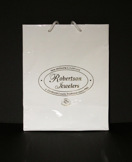 White paper shopping bag with shiny exterior. Two, white rope handles at top. Front and back of bag printed in gold with an oval logo read, "Robertson/ Jewelers/ New Milford•Litchfield/ a Litchfield County Tradition Since 1945." Printed below store logo is a small member logo for the American Gem Society.