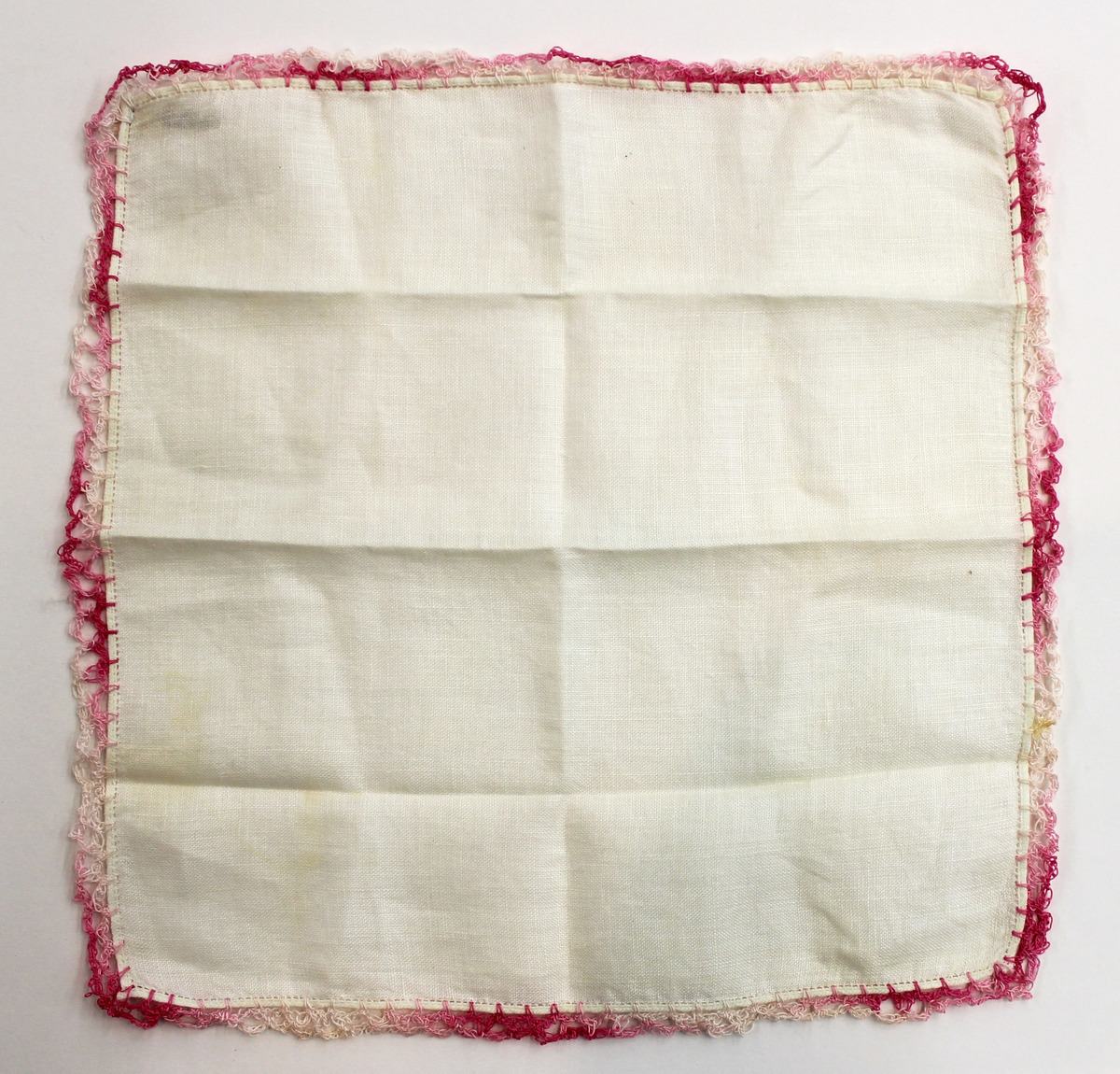 Off-white linen square handkerchief. Pink, variegated thread crochet trim on all sides.