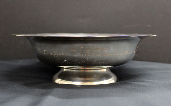Silver bowl with circular foot. Rim of bowl cut in a scalloped decoration. Exterior body of bowl has six separate sections of engraving around the bowl. First section engraved, "May T. Van Winkle/ For twenty years the devoted Treasurer, Counsellor and Friend/ of/ The Litchfield Garden Club/ September 18, 1958." Second engraving reads, "Hildegarde Plehn/ For Outstanding Achievement/ In Conservatoin/ 1972." Third section reads, "Doris Keller Hamlin/ 1975/ Deborah K. Thompson/ 1985." Fourth, "Dorothea DiCecco/ 1996." Fifth, "Marana L. Brooks/ Sharon H.J. Doty." Sixth, "Martha H. Phillips/ 2009."