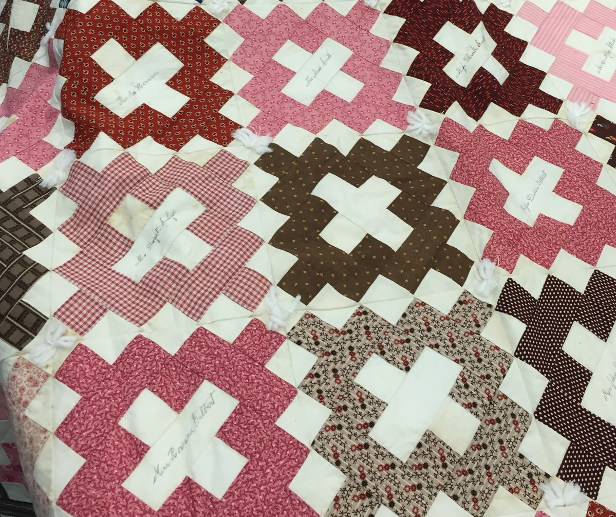 Made by Carrie Peck, her mother and her grandmother Hutchinson in the middle of the 1800s. Donated by the Milton Woman's Club. A list of signatures on the quilt is included in the accession file.