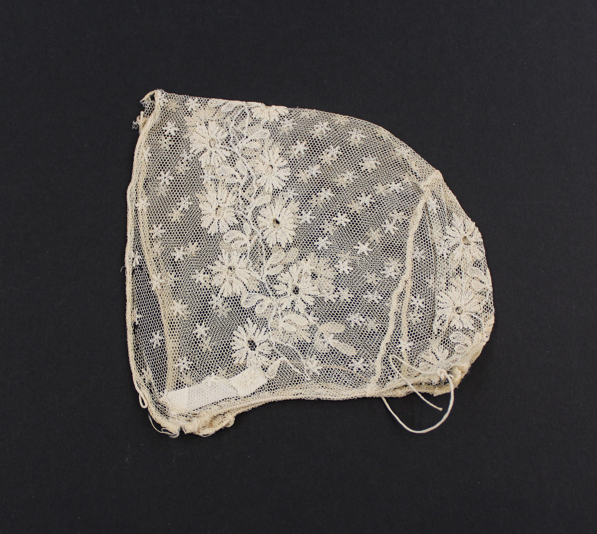 Tan colored cotton embroidered net child's bonnet; stars and flowers; center back section; drawstrings at center back