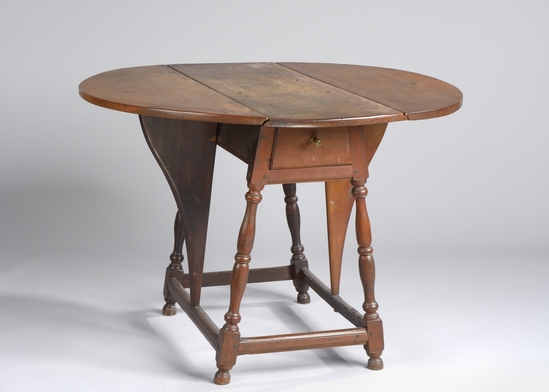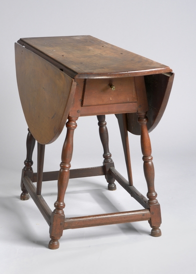 Mid-18th century butterfly table made of cherry. Oval top, splayed base with turned legs and swiveling leaf supports. Stretchers between all four legs; one broken and repaired with a rectangular metal reinforcement affixed to the inside of the stretcher. Single drawer in center of table with replaced knob. Table has been refinished. Top is heavily refinished and has possibly been removed and re-pinned.