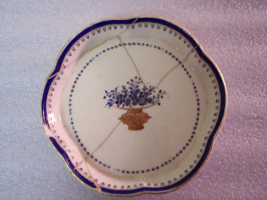 Scalloped teapot stand with six scallops. White with blue and gilt decorative elements -- dots, chains, flowers, and leaves. Also depicts a brown vase with flowers.