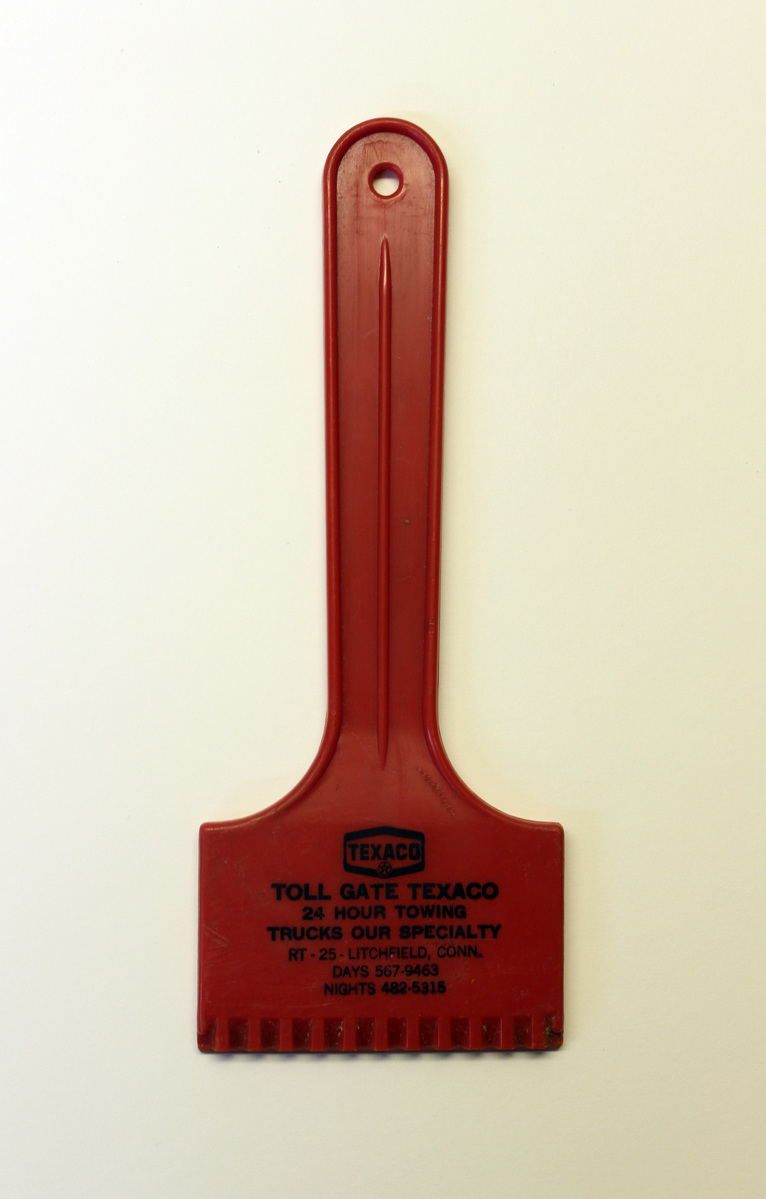Large plastic scraper (probably an ice scraper), produced as a promotional item for Toll Gate Texaco. Molded red plastic with straight handle with rounded end, tapering slightly to a rounded neck. Square blade. Handle has a small hole at the end. Blade has a number of plastic teeth for scraping. Printed black lettering on blade, "TOLLGATE TEXACO/24 HOUR TOWING/TRUCKS OUR SPECIALTY/RT-25-LITCHFIELD, CONN./DAYS 567-9463/NIGHTS 482-5315." Black "TEXACO" logo above.