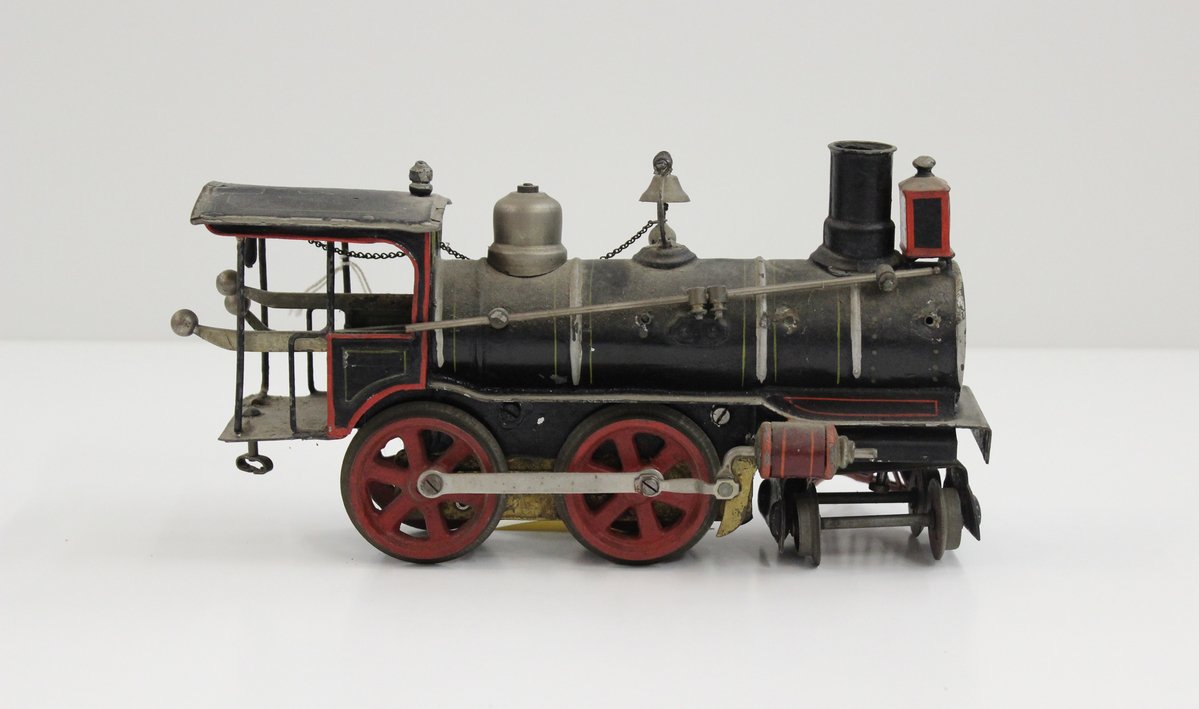 Early 20th-century clockwork locomotive made by Märklin. Black locomotive with red wheels and detailing. The engine has a whistle, bell, smoke stack, oil lamp, and a steam or sand box, as well as an open conductor's compartment. Four-wheeled locomotive with four-wheeled cow catcher underneath the front, also painted red. The conductor's compartment has three silver levers as well as a pull cord for the bell and a hookup for train cars. Square clockwork gear extends from the left. Stamped with Märklin's "MC" shield logo on the front; marked "Gebrauch Muster" underneath.