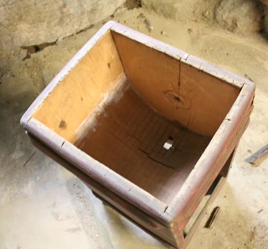 Wooden butter churn. Rectangular shaped box with semi-circular container where butter is churned. Two sides of churn have solid boards that extend to feet and other two sides are open to show body of church. Simple feet with rounded cut out on each side. Lid with arched handle in center. Hole on one side, lined with metal where dasher would be inserted. Dasher is missing. Entire churn painted red with faux grain design in black paint.
