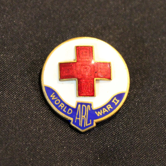 Gold red cross pin. Round. White enamel front with red cross in center of white field. "WORLD ARC WAR II" in gold in blue wave and shield shaped field at bottom of pin.
