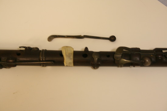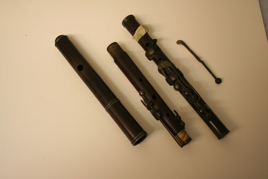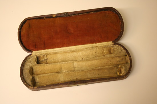 A: Flute - dark wood, wider at mouth hole end, flute pulls apart into three pieces - series of holes with brass keys of various sizes down length of body; brass rings at various intervals down flute; makers stamp at one end "C. Peloubet/New York/Factory at/Bloomfield, NJ" B: Case - Elongated oval shaped wooden case covered in red leather; brass lock on front; paper hinge; inside formed to fit flute pieces; top padded with red velvet