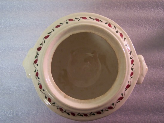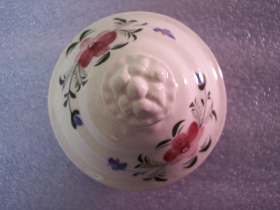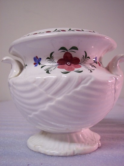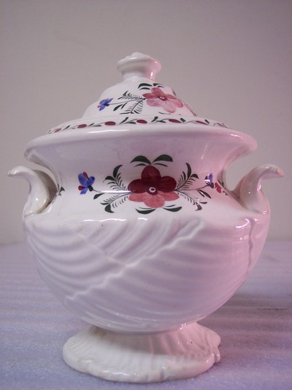large bodied sugar bowl, Base (A) is slip molded in shell form and has painted polychrome floral designs. Has 2 loop handles. Lid (B) is domed with knob of seashells