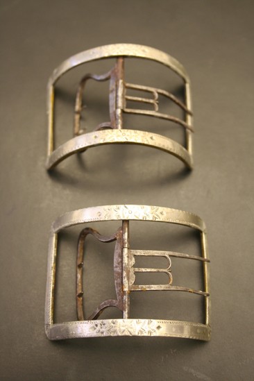 Silver shoe buckles. Rectangular shape but rounded body. Front of buckle decorated with etched floral design. Center shank made of brass. Two pointed pronts on one side and shaped shank with small pointed ends on other. Rod down center.
