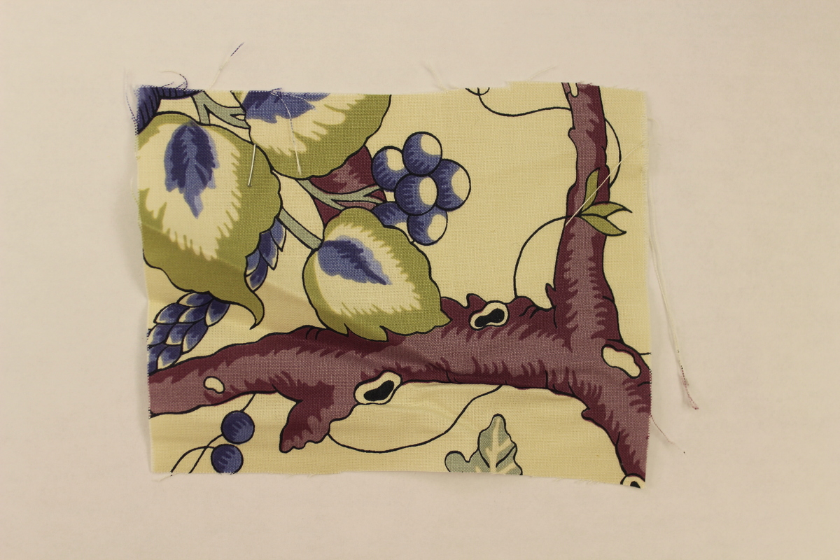 Rectangular fabric swatch made of synthetic material. White with a large purple branch running across it. Large green, white and blue leaves, and blue and white flowers extend from the branches. Fabric is slightly rough to the touch.