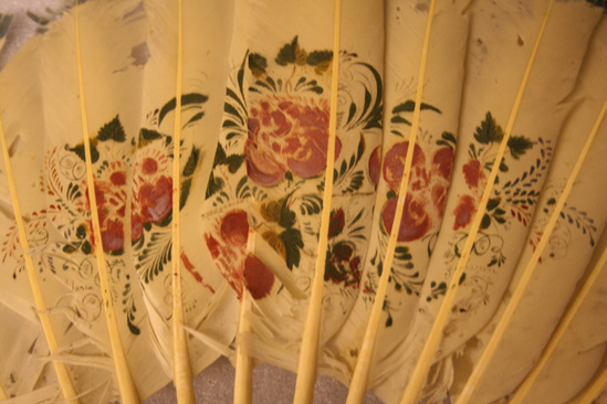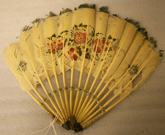 Fan made of 15 white feathers. Stem of each feather placed into black leather socket which holds feathers in place. Blue ribbon wrapped around feathers above leather piece. Red and green floral design painted across body of fan. Signed "Maria Johnson"