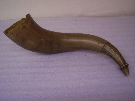 Curve very pronounced and tapper very pronounced. At large end 2 chips out of rim and 3 holes (1 partial) opposite 1 single hole. 4" from end - natural form stops and 9 sided portion 3" (1 band of cross hatch, 1 plain, 1 parallel llines with 2 cross hatches, 1 circle and arrow, 1 cross hatch, 4 circles and scallops) Flared neck and tapering to small opening. On larg eend "Robin/Hood at large end; small peacock; roof lines of steeple and gable ends with dots interlaced; serpentine line; has sign of waved lines in circles; large steepled 2 story building with 3 windows each floor, round gable window - cross hatched steeple with Beiron underneath; abstract partial building; 3 small 2 story houses together with shorter one in middle - 1 window end story with chimney on top; 1770; PEA KOCK/acutal peakock; street scene with large building 2 stores with 3 windows each gambrel roof with 2 windows in gable end, hip roof 2 story building w/2 windows with pointed cornices; chimney; 2 story building 2/3 windows per story - round one in gable end of hip roof - steeple, H.H., small 2 story with hip room with 1 large window per story - large 2 story house with end chimney windows on each story on sides and 2 circle windows in gable end - lean to in back - hangman's gallows, small hut with chimney - all on side walk - partially framed "LITCHFIELD KILBOURN COURT BS" vertical line with egg and dart; Gentlemen Bring in Your/Votes E or your Second Deb/ry" AA; partial 2 story house; DW upside down
