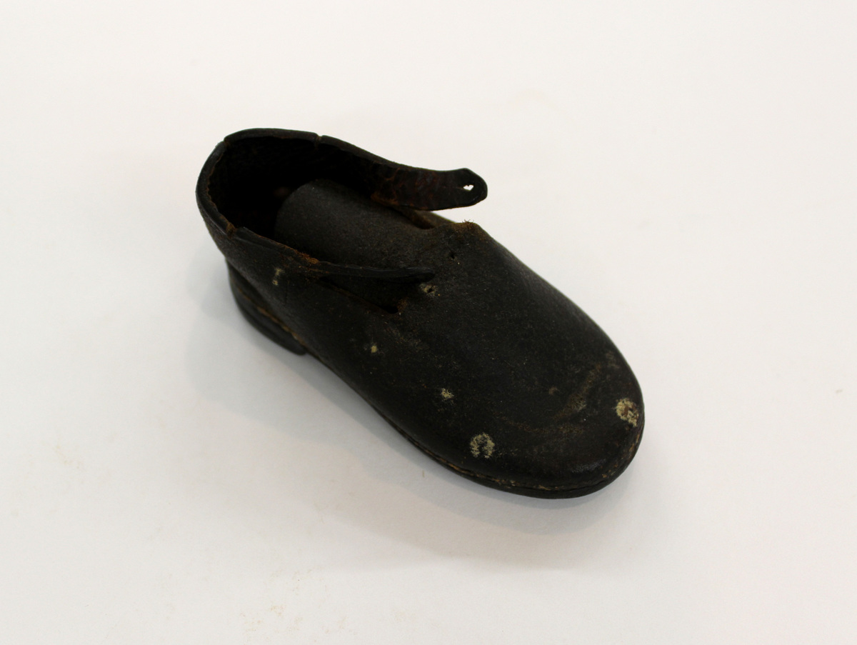 Dark brown leather child's shoe; tongue with two straps on either side with hole at end to run lace through; rounded toe; no lining; wood heel and soles; leather sole