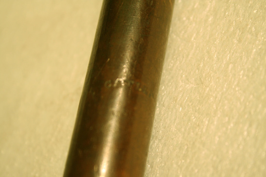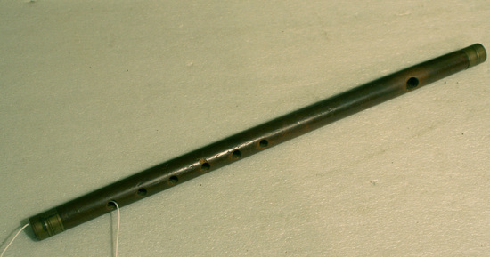 Small thin wooden fife. Brass cap on each end with incised line design. Mouth hole at one end and six finger holes at opposte end. "Catlin" impressed into wood underneath mouth hole.