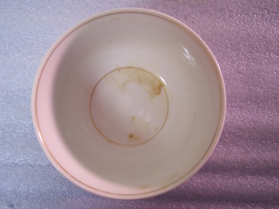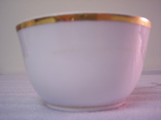Small slop bowl with high sides and wide gilt band on exterior lip. Thin gilt band on interior lip. Gilt circle on the inside at the base and around the exterior base.