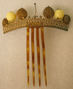 Woman's hair comb. 4 teeth made of tortoise shell. Ridge made of pressed metal in pierced design. Alternating along top are larger round beads. Four are pierced metal and three are white plastic however center white bead is missing.
