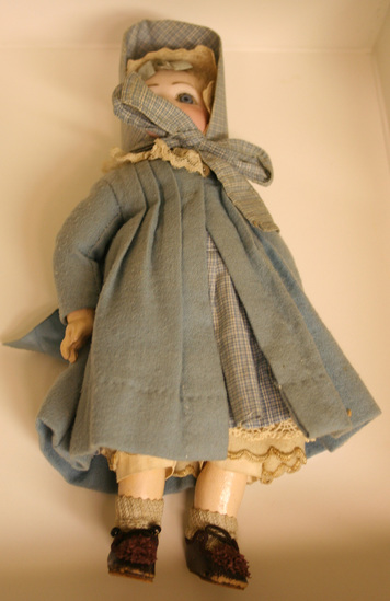 Doll with porcelain head and composition body. She has blond hair, blue eyes and blue earrings. She wears cotton pantaloons, a shirt, a wool and a cotton petticoat, a blue gingham dress, and a blue woolen coat with a lace collar. She wears a blue silk ribbon in her hair and a lace cap with a sun bonnet to match dress. She has socks and black shoes with brown pompoms. Stamped on the bottom of one shoe "E. Jumeau/Medoc/1878/Paris" and on the back of the doll's body "Jumeau/Medaille D'or/Paris"