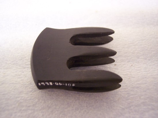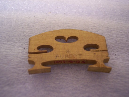 a: Bridge for violin. Marked "Aubert", wood 1 3/4" wide x 1 1/4" high b-e: 4 keys for tightening strings on larger instruments. Labelled "D" "G" "A" "E" 2 1/2" long x 3/4" wide, ebony f: Mute for violin, marked "[ECHOSLO]" ebony 1 1/2" wide x 1 3/4" high g: Scroll for top of stringed instrument 4 1/4" long x 1 3/4" wide at widest point, base has broken off, has holes for keys, no finish or varnish h: Scroll for top of stringed instrument 13 3/8" long x 1 3/4" wide, no key holes, varnished, for vilonia i: Scroll for top of stringed instrument 15 1/2" long x 2" wide no key holes, varnished, for vilono