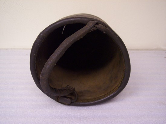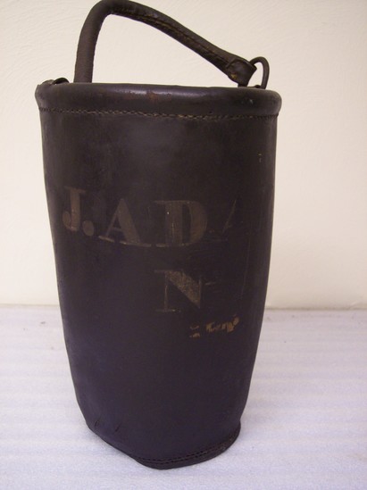 Black leather fire bucket marked in white paint. Iron circle attached handle. Double stitched base; fold over single stitched top. Painted in white block lettering on side "J. ADAMS/No. II"