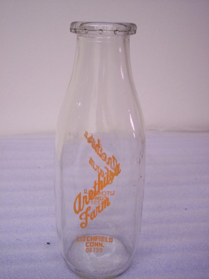 Quart milk bottle from Arethusa Farm. Clear glass with orange paint. Printed on bottle "Arethusa Farms Litchfield, Conn"