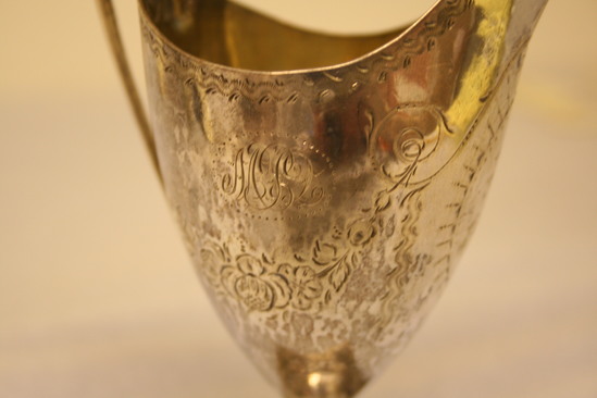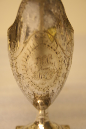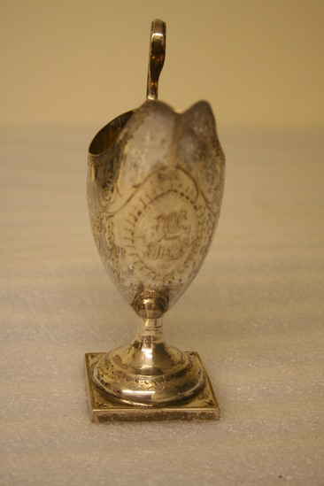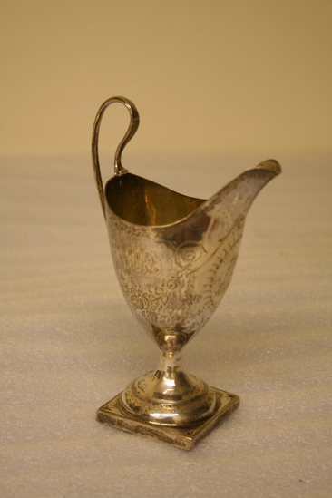 Urn shaped cream pitcher with lip and deep cut sides with straight edges. The graceful looped handle is attached at top of rim and riveted to base. The urn is attached to a hollow, round standard with a square base. The top edge, sides and base are engraved decoratively. On front are initials "EES from E.M. CS to MF P.C" On side initials "MPQ"