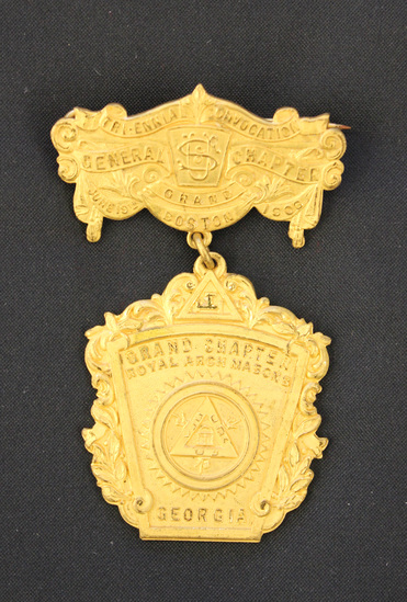Gold Masonic medal. Oblong bar at top with scroll and ribbon decoration. "TRI-ENNIAL CONVOCATION / GENERAL CHAPTER / GRAND / JUNE 19TH BOSTON 1906" stamped on it. Hanging below oblong bar is a shield-shaped pendant with vine decoration on sides. Triangle at top and Masonic symbols in center. "GRAND CHAPTER / ROYAL ARCH MASONS / GEORGIA" stamped in main body. Reverse of pendant stamped "THE C.G. BRAXMAR CO. / 10 / MAIDEN LANE / NEW YORK."