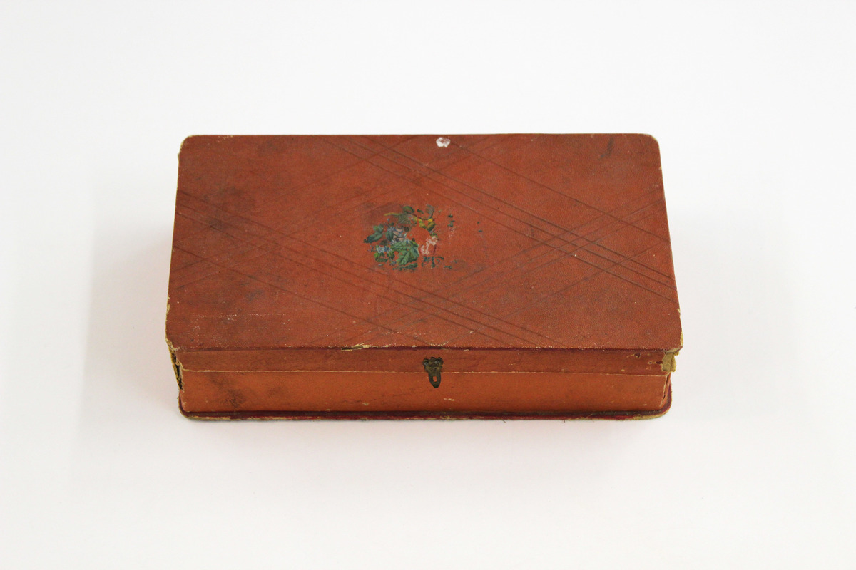 Rectangular board box covered in orange embossed paper, meant to resemble tooled leather. Embossing done in intersecting angled lines to resemble plaid pattern. In the center of the lid is a partially-complete pasted color decal of flowers and a green and yellow bird. Small decorative brass catch on front of lid. Top of box lined with French newspaper, bottom lined with white embossed paper.