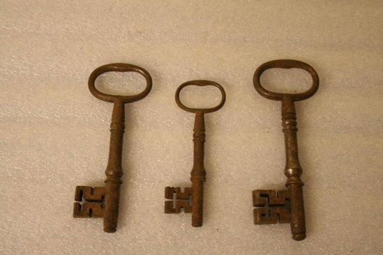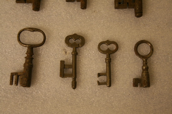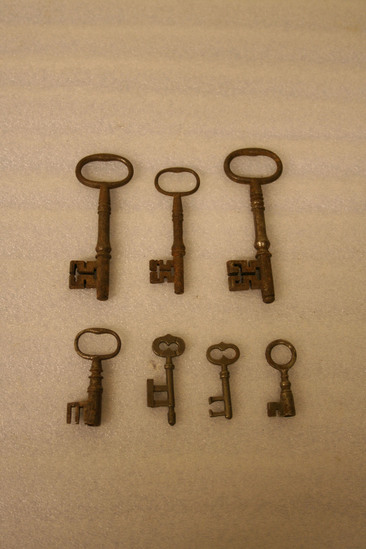 7 Keys of various sizes from the Wadsworth House (Kilbourne) on North St. All have rounded heads with a molded shaft and blockish shaped protrusion on one side of shaft.