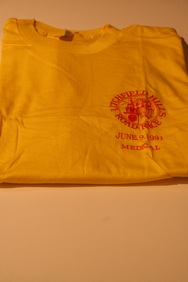 Yellow short sleeved t-shirt. Logo on upper left hand side of shirt, printed in red. Circle logo with runners and steeple of clock tower. "Litchfield Hills Road Race" printed around outer edge of logo. "June 9, 1991" and "Medical" printed below logo.