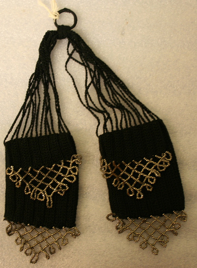 Woman's coin purse, "Miser" style, in black crochet, two rectangular purses each crocheted in vertical ribbed pattern, purse flap and lower edge decorated with triangular shaped, criss cross open steel beadwork ending in loops, each purse with 14 crochet chains which keep the openings closed and attach the two purses, chains gather at a central point where they are tied over a covered wire loop.
