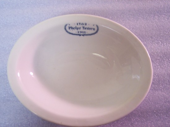 Oval medium sized soap dish, rounded bowl-shaped interior with deep sides, a flat edged lip, and flat base. Probably lead-glazed white stoneware, based on weight of object. Phelps Tavern logo transfer-printed in blue-green on inside of bowl. Maker's mark on the base is of the same color, and also transfer printed.