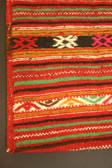 Large bag with red and black braided wool handle. Woven design of predominately red, black and green striped pattern.