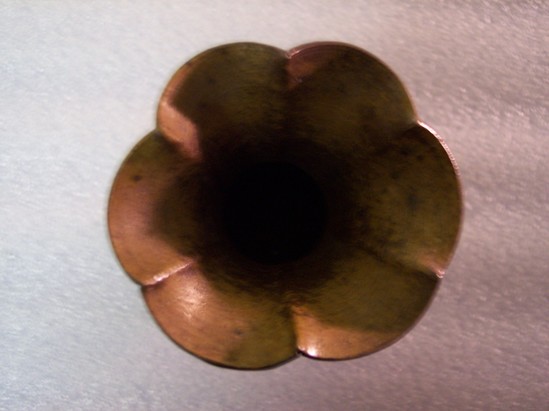 Smaller version of 1909-10-1. Has grape leaves and vine decorations. 2 handles like twisted vines. Rim has 6 scallops. Brown matte glaze.