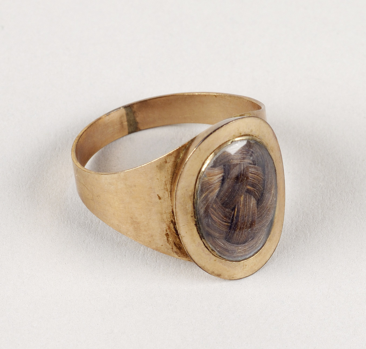 Wide rose gold band on top of which is oval setting with oval crystal, back of which is brown woven hair of Frederick Augustus Tallmadge, husband of Eliza (Canfield) Tallmadge. In original red leather ring box with purple satin lining in lid and purple velvet lining in base, hook closure.