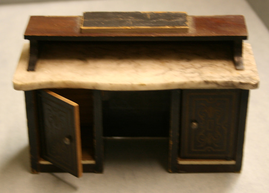 Oblong base, two side cupboard with rail handles and gilt paper fronts, center kneehole, marble top with curved front and 1 shelf on back, painted dark graining and papered black back.