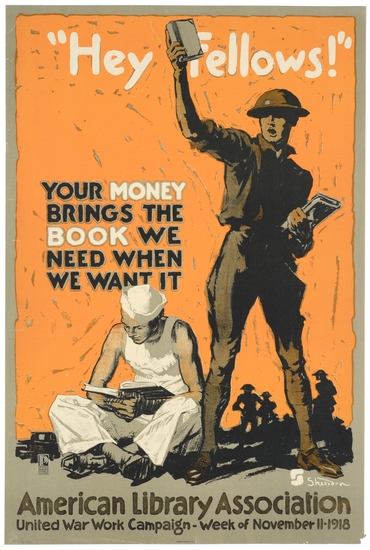 World War I poster. Grey border with orange background. Soldier at right, holding a book aloft and one in other hand. To his left another soldier is seated reading a book. The poster reads, "Hey Fellows!/ YOUR MONEY/ BRINGS THE/ BOOK WE/ NEED WHEN/ WE WANT IT/ American Library Association/ United War Work Campaign - Week of November 11 1918."