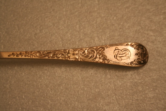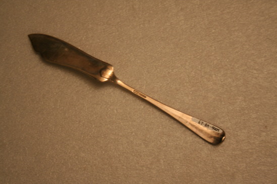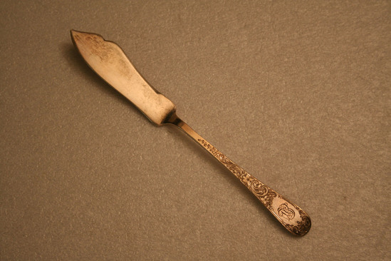 Silver butter knife, flat blade, pointed at end, shaped on one side. Handle raised slightly above blade. Etched design of scrolls and flowers on front of handle. Monogrammed "ELD" Maker's mark stamped on back - 3 symbols and "STERLING"