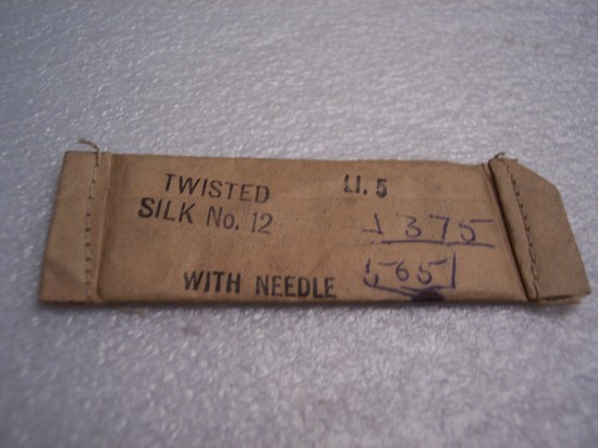 Brown paper oblong packet sealed with box on one side in black ink - "Method of Preparing/and Enclosing Legatures/Pat. Feb. 11, 1902" On back of packet "Twisted/Silk No. 12/With Needle" Ends of packet are sewn together.