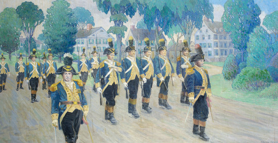 Oil on canvas painting, genre scene, take directly from a photograph of Putnam Phalanx on August 2, 1920, State Day of the Litchfield Bi-Centennial, photo by W. N. Copley. Lines of marching men, in all, in blue uniform marhing across north Street, view of corner house and Phelps tavern. Originally in the "Lindens", purchased from the Mrs. Ludlow Bull Estate. Signed lower right: "ADELAIDE DEMING"