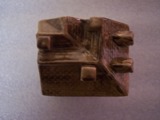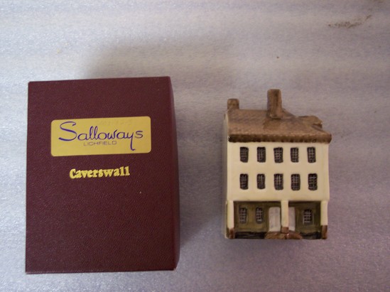 Small ceramic ornament depicting the house where Samuel Johnson was born. Brown roof with 3 chimneys. A cream-colored structure with black windows and a green entry level. Back reads: "Johnson's Birthplace. Lichfield commissioned by the Johnson Society of Lichfield in 1984 to commemorate the bicentenary of the death of Samuel Johnson. No. 172. Coverswall fine china."