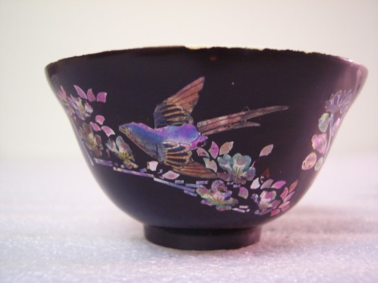 White porcelain covered with black, cold-painted enamel. Mother-of-pearl floral designs. White interior. Teacup has flared sides and no handle.