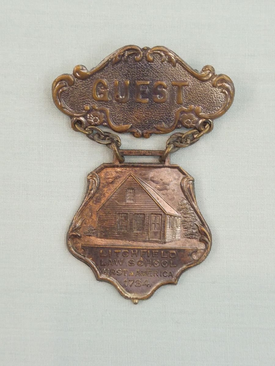 Badge consists of two pieces connected by a pair of short chain link chains. Top piece has scrolled/scalloped edge. "GUEST" in raised letters; pin on back. Bottom piece is hexagonal shape but edges are rounded; raised image of Litchfield Law School. Underneath "Litchfield/Law School/First in America/1784" Printed on back of bottom piece "1720-1790/Litchfield, Conn/Bi-Centennial/August 1st-4th/1920"